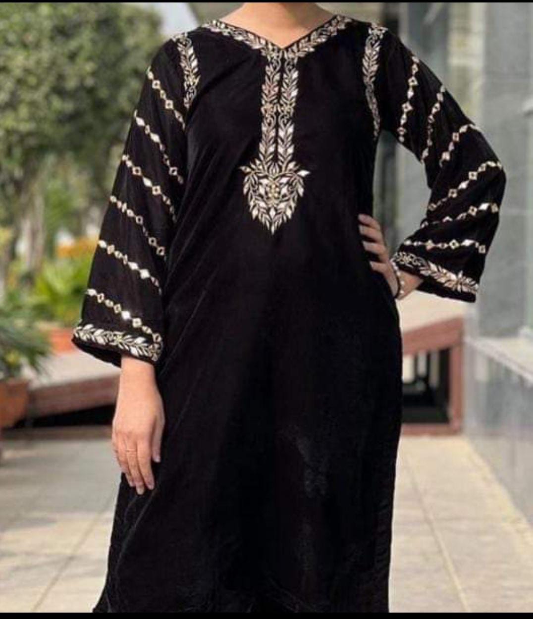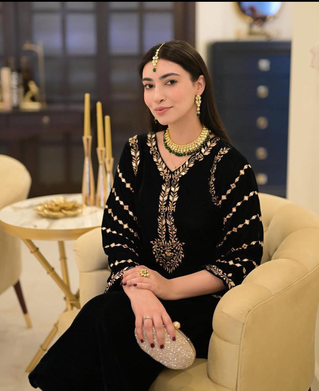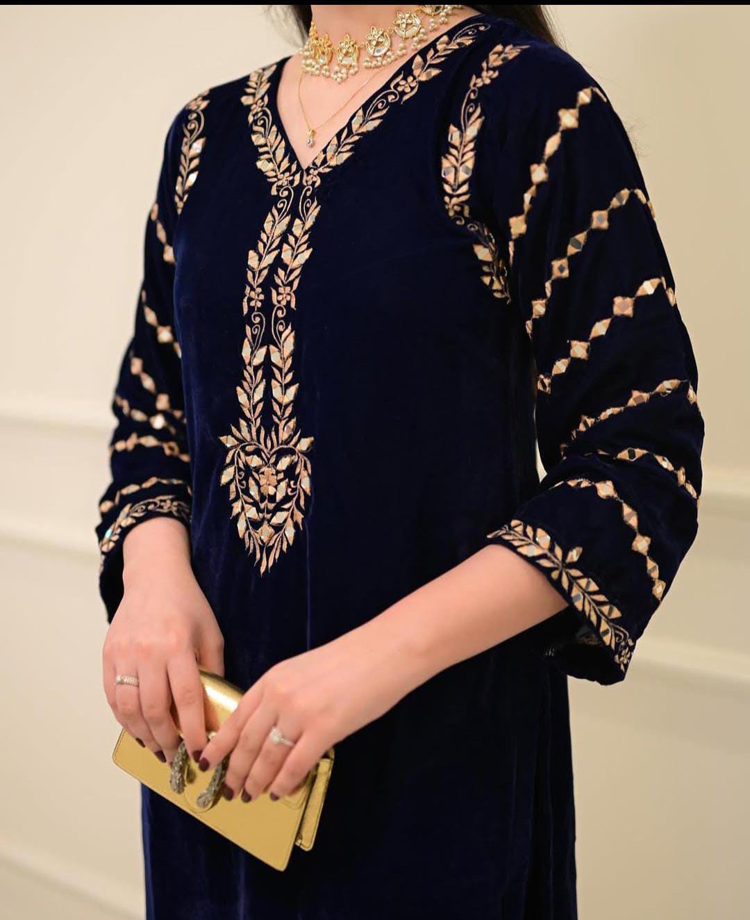 Velvet Tilla Emb + Sheesha Work Emb Shirt With Plain Velvet Trouser..